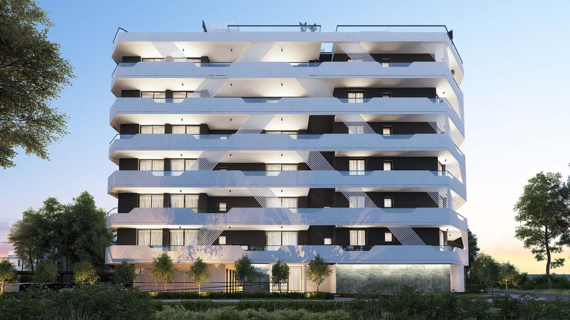 Experience the blend of luxury and privacy in these exclusive 2 bedroom flats, located less than 200 meters from the shore, offering unique sea views. Each storey houses just two apartments, ensuring utmost privacy. The sixth floor residences boast private, opulent roof gardens with stunning neighborhood vistas. Situated conveniently within walking distance from the American University, less than 2km from Finikoudes, and highways to Nicosia, Limassol, Paphos, and Ammoxostos, the property is a masterpiece of modern design. Crafted by expert architects and interior designers, it features top quality Italian ceramic finishes, distinctive glass balconies, and thoughtfully arranged living spaces for optimal space, privacy, and panoramic views of the esteemed area.