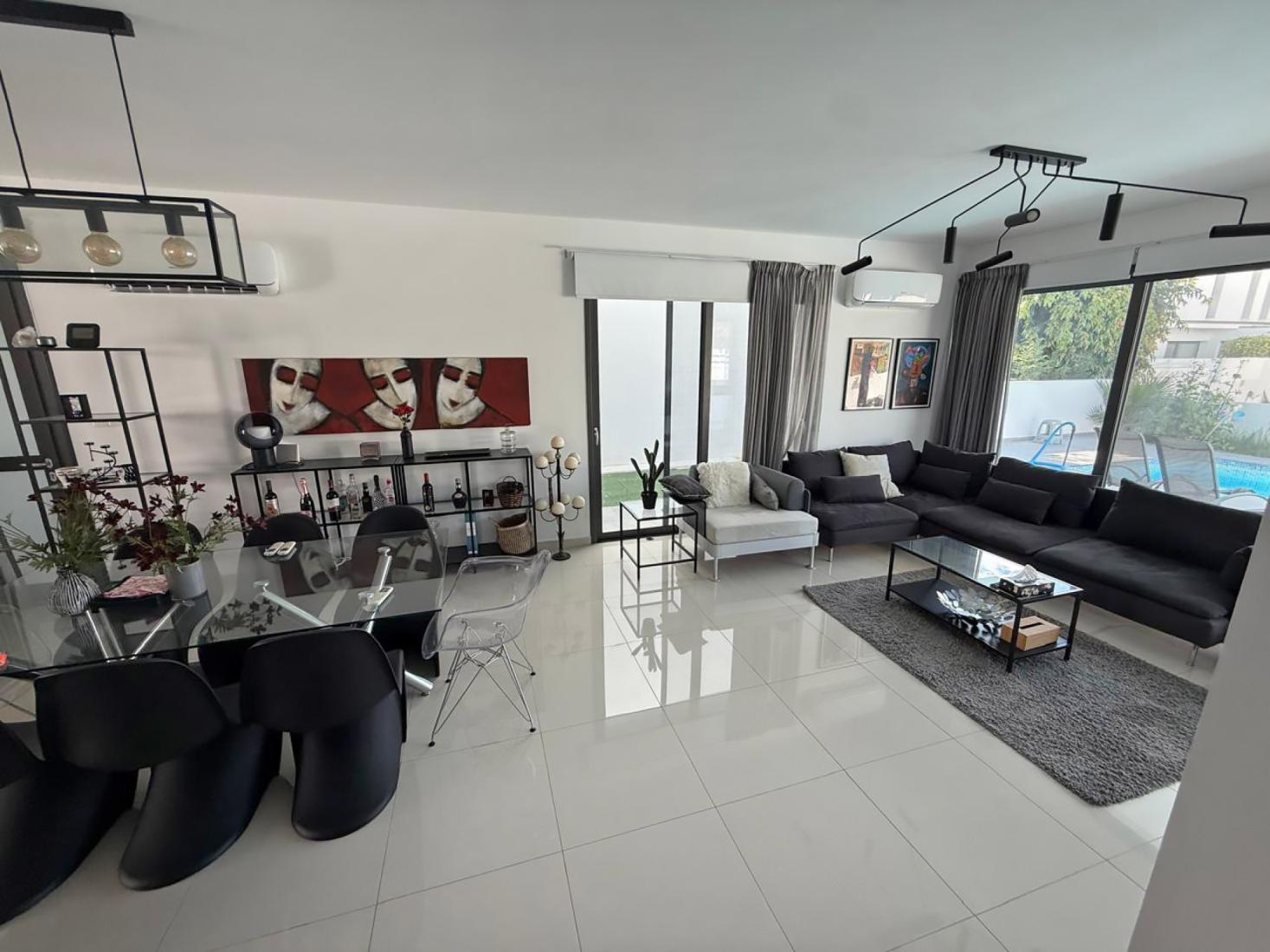 Spacious and fully furnished three-bedroom house located in a very quiet and pleasant residential area, ready to move in. The property offers a bright and airy living space filled with natural light, creating a warm and welcoming atmosphere throughout. Large openings connect the interior living area seamlessly with the outdoor space, leading directly to a private swimming pool—perfect for relaxation and entertaining. Ideally situated close to the Larnaca Nautical Club and just approximately 440 meters from the waterfront, the home enjoys an excellent location with easy access to the seaside. It also offers convenient connectivity to the city center and all everyday amenities, including shops, restaurants, schools, and services. Combining comfort, privacy, and an excellent location near the sea, this property is an ideal choice for those seeking a relaxed coastal lifestyle in Larnaca.