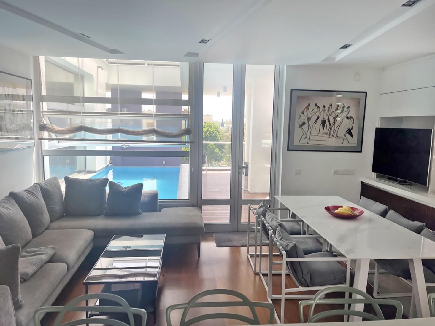 One of a kind, luxurious whole floor penthouse with roof garden . Easy access to GC school, European University and English school, American and Russian embassies. Very large modern kitchen with separate laundry room, family room, large dining room and double main lounge with two - sided wood-fireplace and wooden floors. 3 large bedrooms all en-suite plus guest toilet plus maid's quarters (with bathroom and kitchenette). All bedrooms windows with electric shutters, fully a/c and underfloor c/h, alarm, WiFi and sound system throughout, infinity swimming pool covered with sliding glass roof with solid wood decking on main floor plus roof garden with BBQ area. All electrical appliances and curtains included.